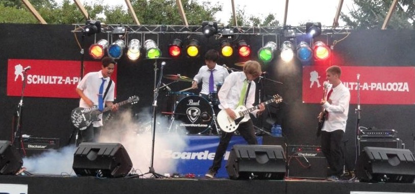 (Image: Boarder Line on stage at Schultz-a-palooza. Photograph courtesy of Boarder Line.)
