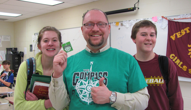 (Image: Matt Hoffmann, Compass committee member, shows off a Compass point to interested sophomores Katie Espen and Jordan Rittmann. Photograph by Beth Williams, Current Staff.)