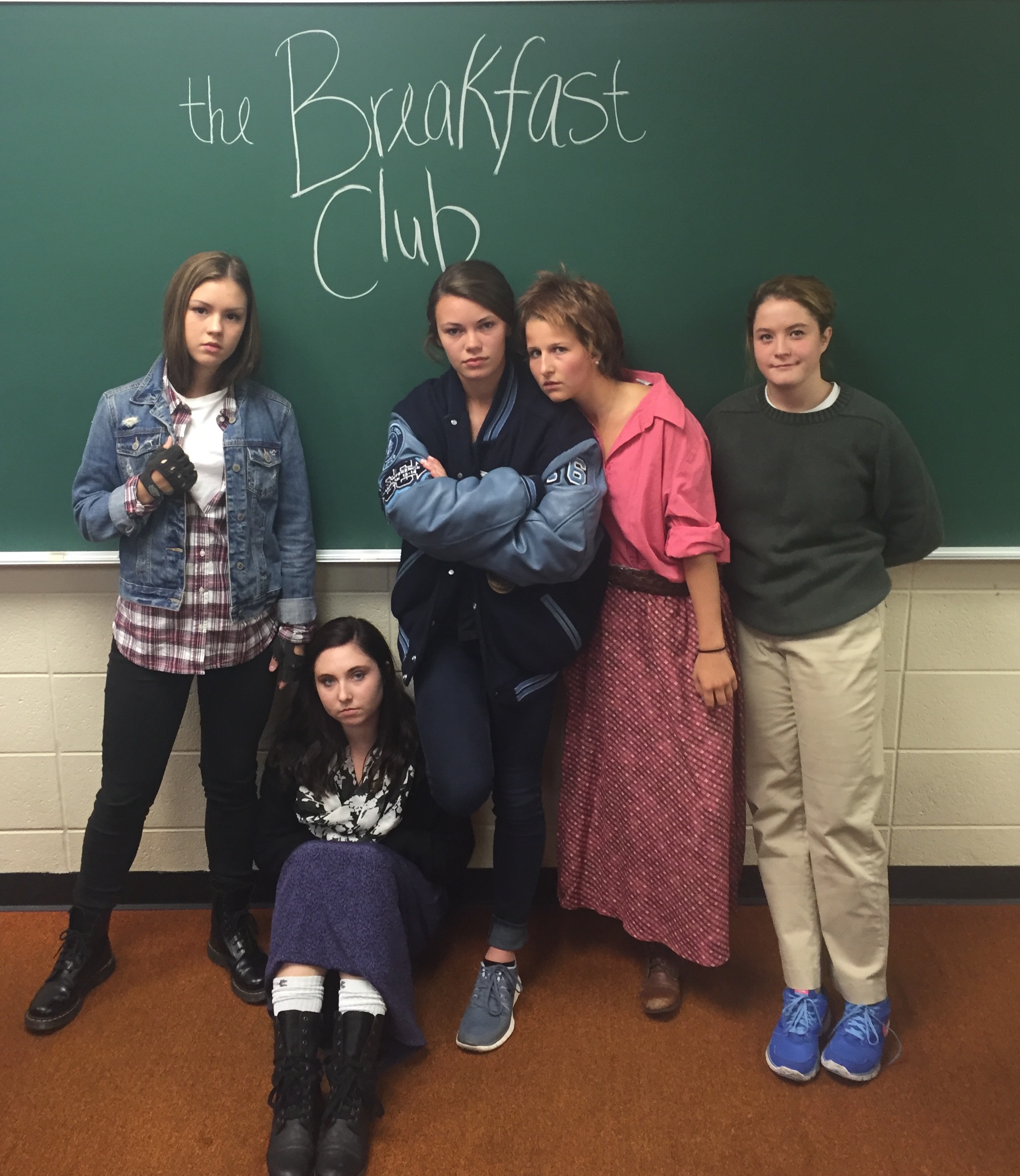 (Top image: East seniors Katie Opgenorth [the criminal], Madeline Mollwitz [the basket case], Julie Schneiberg [the athlete], Elizabeth Bensen [the princess] and Natalie Lutz [the brain] dress up for Dynamic Duo Day. Photograph courtesy of Madeline Mollwitz.)