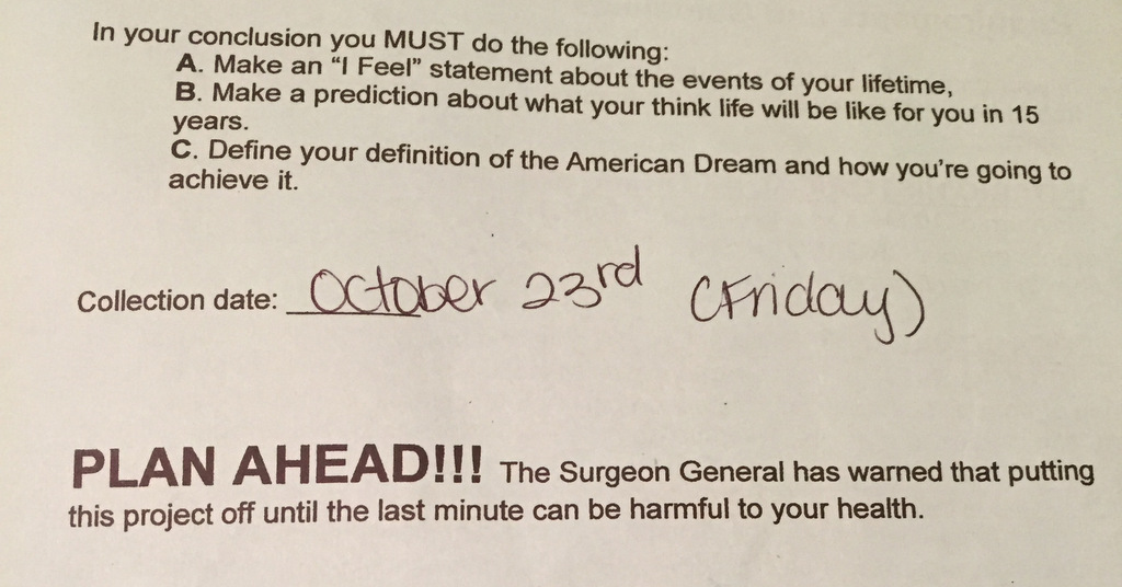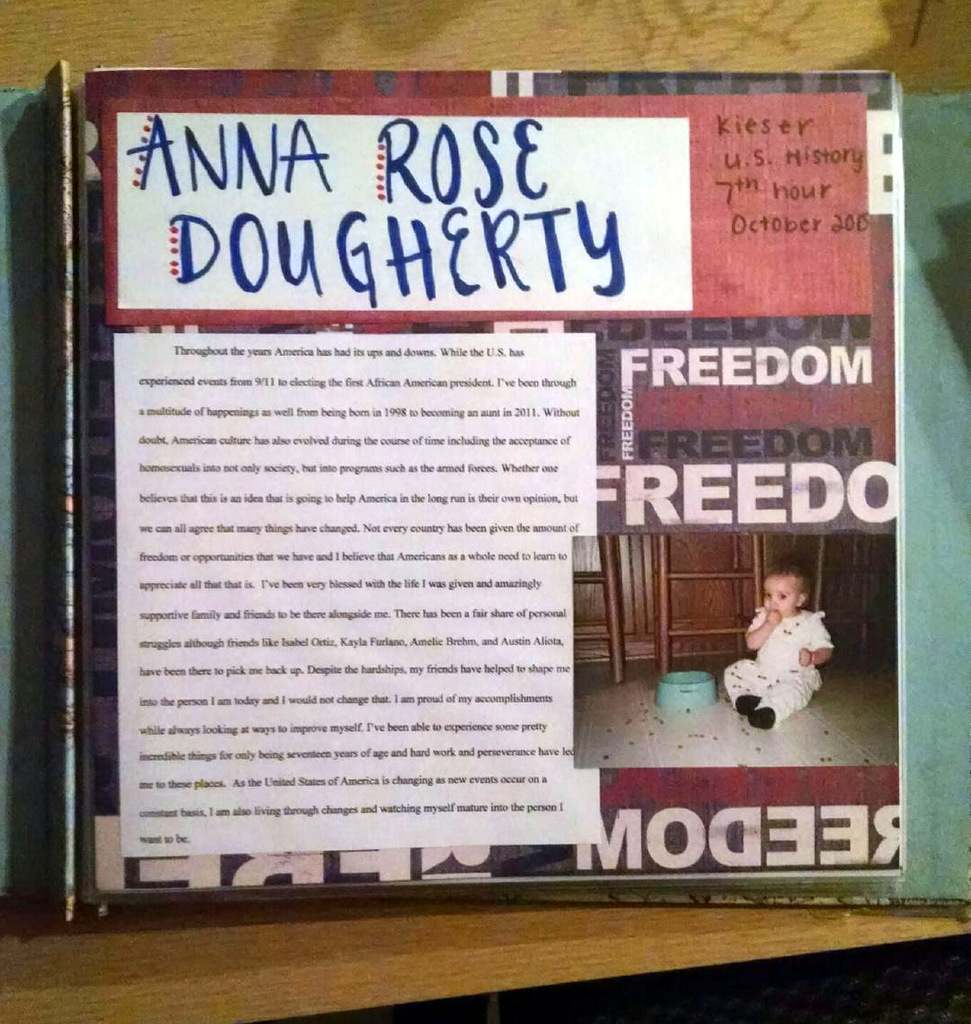 Currently she is taking U.S. History, a class notorious for its Chronicle Project. This project requires students to create a book or binder detailing 20 major events of their lives. It also must include images, an introduction, and a conclusion. It is very hard to pass the class without completing the project.