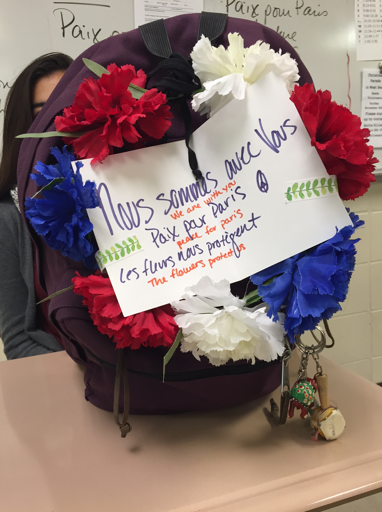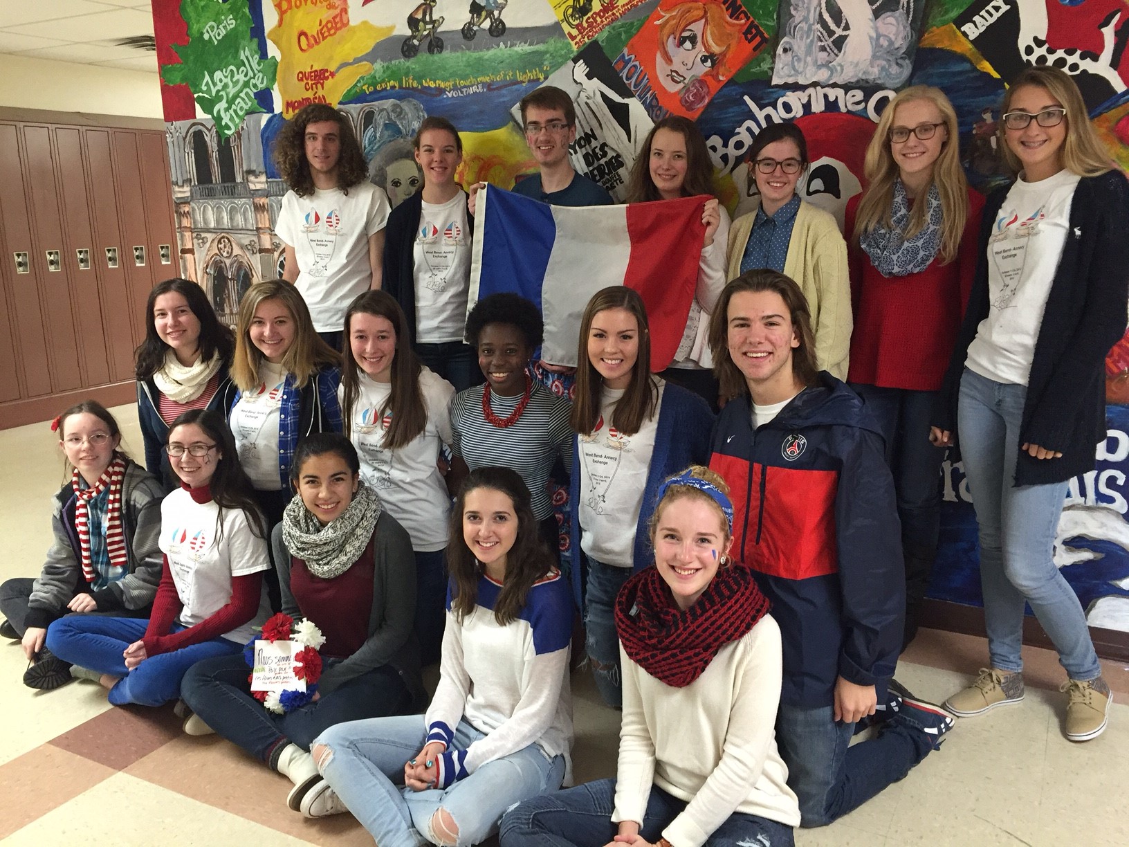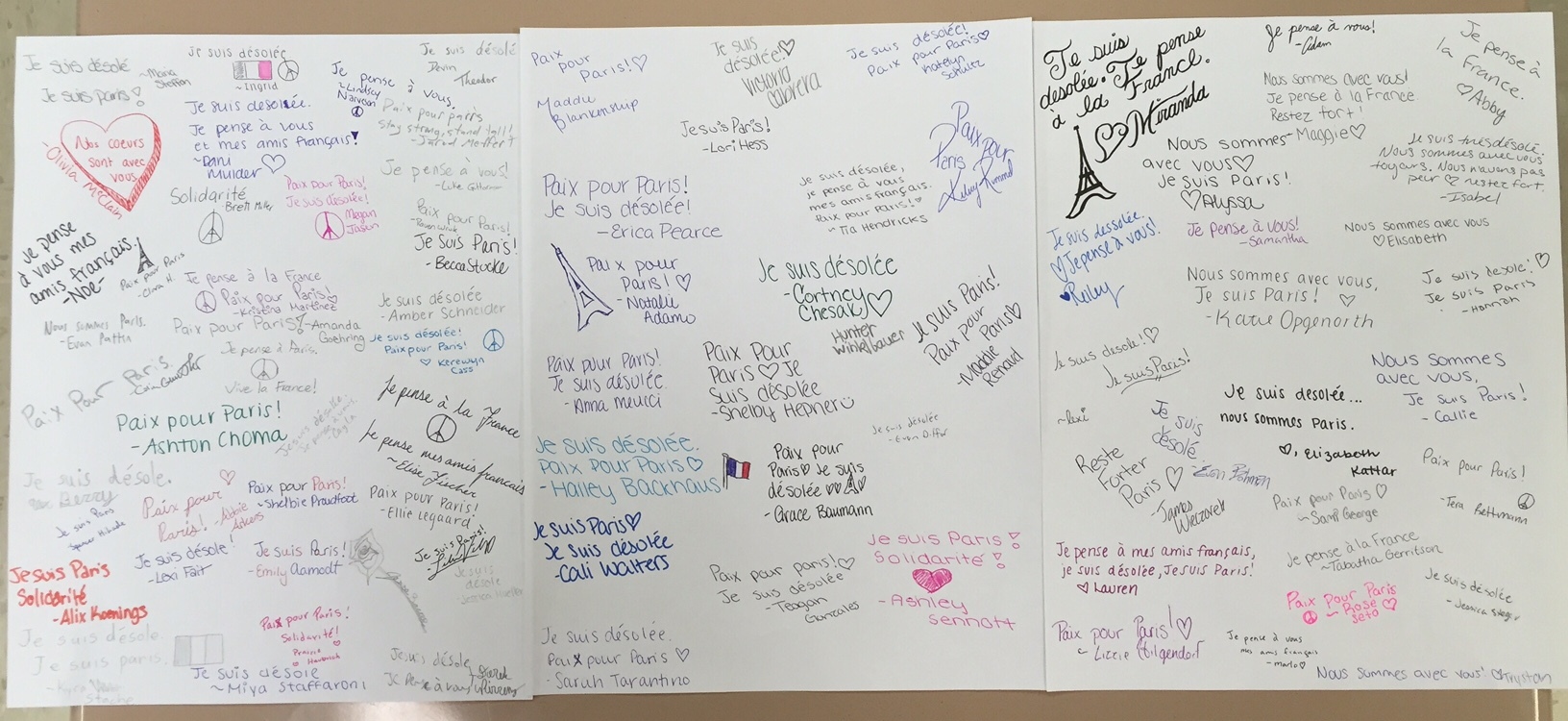 Today French students were encouraged to wear blue, white, and red (the colors of the French flag) in support of “Paix for Paris” (Peace for Paris) Day. Students signed cards for the French high school that participates in the exchange, took pictures to also send, and continued to gather information about the attacks and how France is healing.