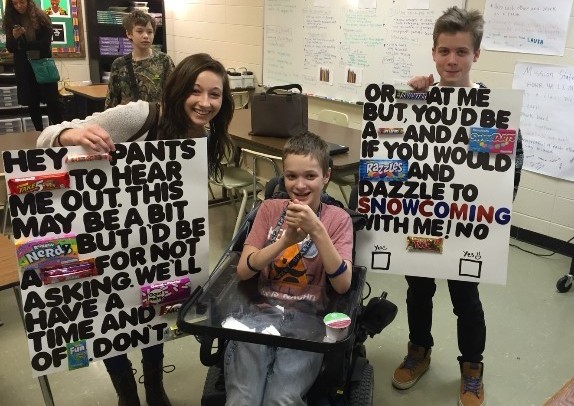 Austin, a West ninth grader, has cerebral palsy, which is a disorder of movement, muscle tone, or posture. He also has OMA, a visual disorder. He was surprised when Lexi Isaac, an East junior, asked Austin to the WBHS Snowcoming Dance on Feb. 27, especially because she did so in a big way.