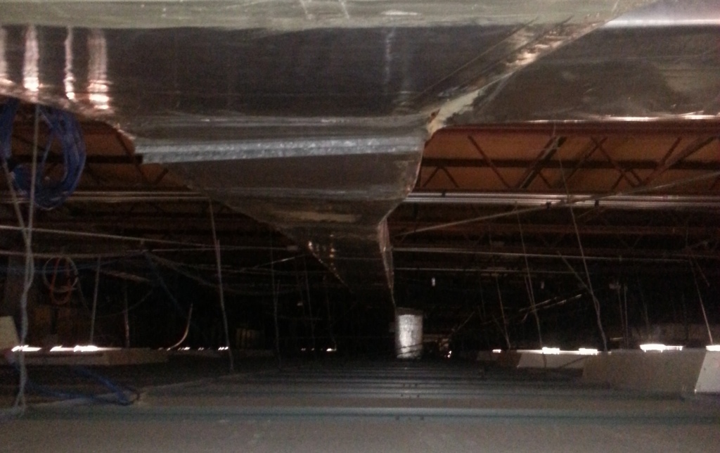 (Image: The ducts above the ceiling tiles along the S hallway. Photograph by Isabel Krueger, Current Staff.)