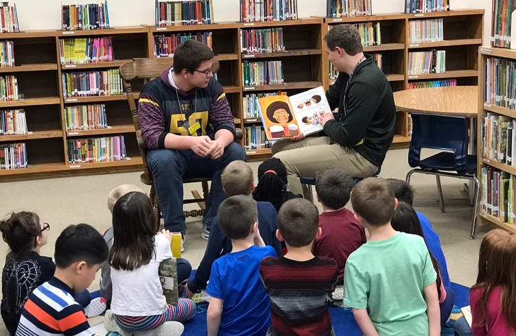 (Top image: East seniors Jason Myrick and Sam Scherzer read to students at Decorah Elementary School. Photo courtesy of Dennis Ziegler.)