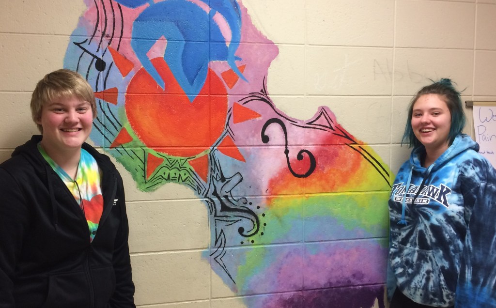 (Top image: Greta Polinski, left, and Abigail Haas with their mural in the M hallway. Photo taken Thursday by Samantha Dietel, Current Staff.)
