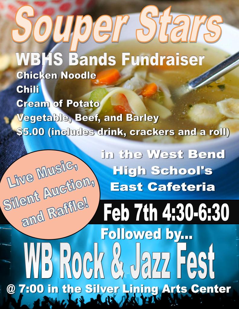 The Rock & Jazz Fest is 7 p.m. Wednesday in the Silver Lining Arts Center. Admission is free. The West Bend bands also invite all to stop by the Souper Stars fundraiser from 4:30 to 6:30 p.m. to support the band program and get a delicious meal.