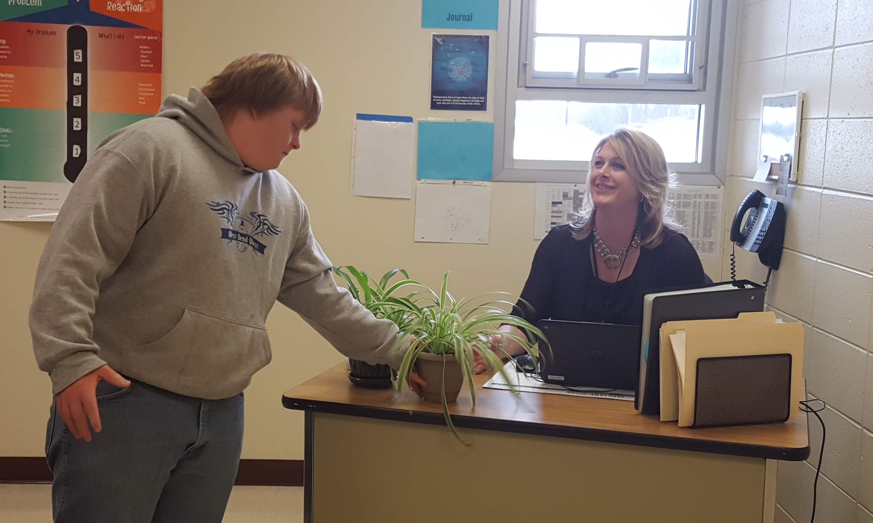 When they are not learning skills in the workplace, students also have the duty of delivering plants during school hours. The Rent-a-Plant business is open to staff at the high school. They purchase a plant every week, and it is the students’ job to take care of them. The plants are picked up on Fridays, given water and sunlight, delivered on Mondays, and the process starts over again each week.