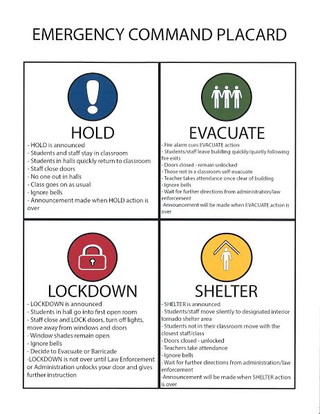 The high schools also practice different emergency procedures. Emergency command placards are posted throughout the building and list the instructions for the four different emergencies: hold, lockdown, evacuate and shelter.
