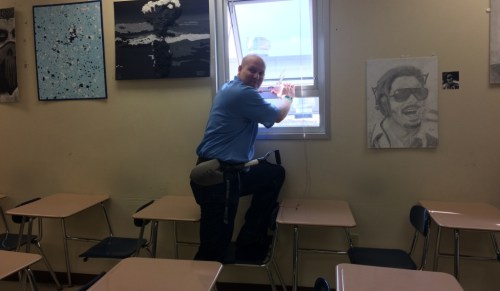 (This article is the final part of a series of stories about school safety. Top image: West social studies teacher Aaron Paulin, equipped with his shovel that hangs in the classroom every day, demonstrates how a student would reach the window in an effort to escape the classroom during an intruder situation. Photo taken Friday by Samantha Dietel, Current Staff.)