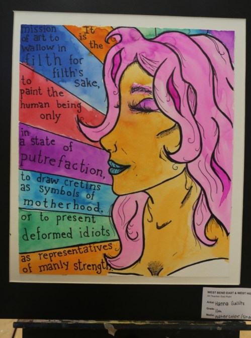 The art show is 4-7 p.m. Wednesday in the Silver Lining Performing Arts Center atrium. Art and written work from local students will be on display. Students of West Bend High Schools will be able to tour the gallery during the day with their classes.