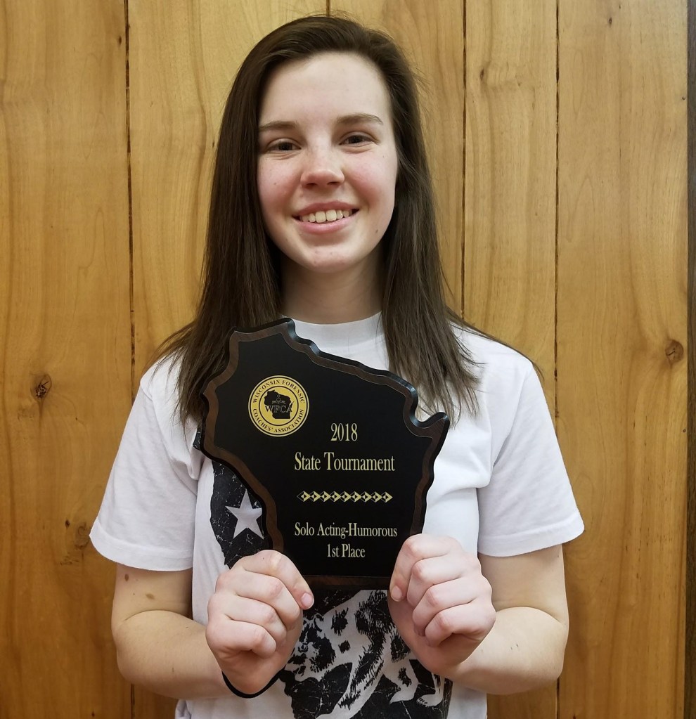 The Wisconsin Forensic Coaches’ Association describes the category as “bringing a humorous text to life through solo performance.” Kolb says she was incredibly surprised when she was revealed as the state champion.