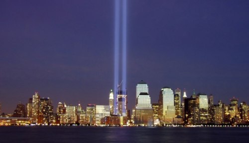 (Top image: Two beams of light represent the former of the World Trade Center during the 2004 memorial of the September 11, 2001 attacks. Photo by Derek Jensen, courtesy of Wikimedia Commons.)
