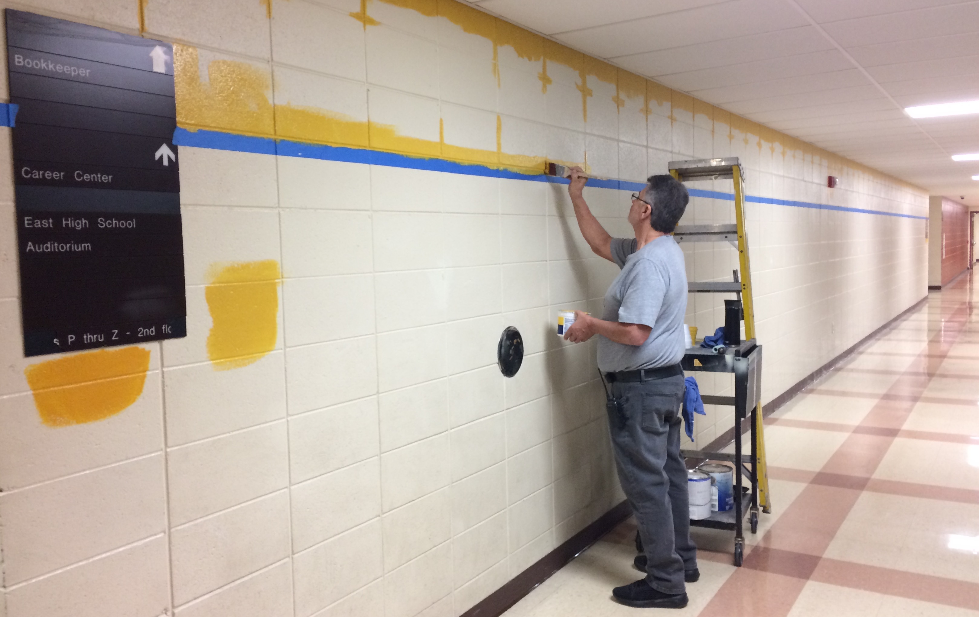 (Top image: Maintenance worker Dave Hamilton paints the East wall of the H hallway on Jan. 16. Photo by Samantha Dietel, Editor in Chief.)