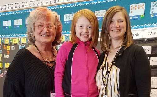 (Top image: Karen Carlson, right, was able to introduce her daughter, Evelyn, to her first grade teacher Mary Mayer Feb. 21 at Jackson Elementary School. Photo courtesy of Carlson.)
