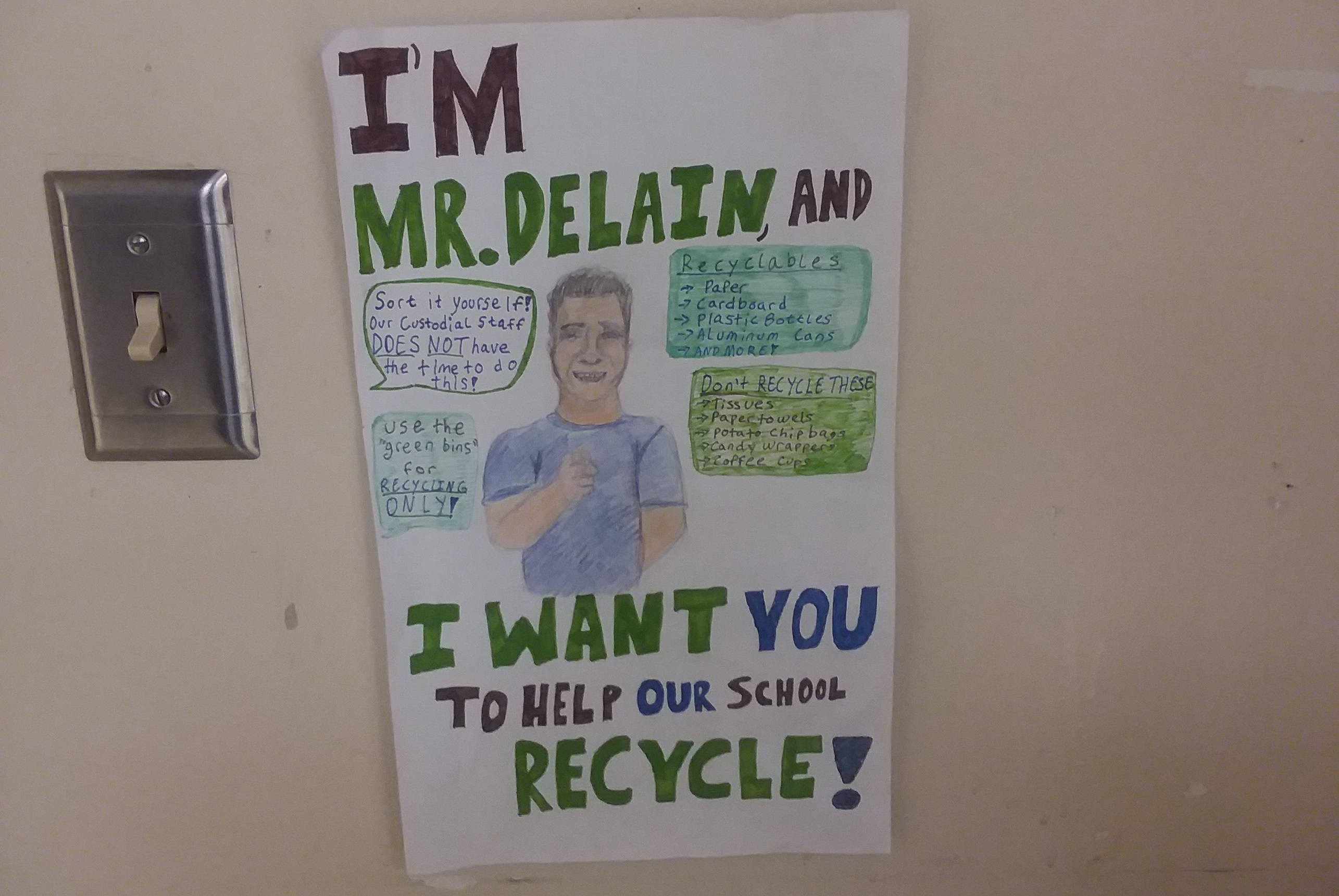 (Top image: A sign made by SEED hangs in Paul DeLain’s science classroom and shows what things students should and shouldn’t recycle. Photo taken Dec. 20 by Noelle Mentch, Current Staff.)