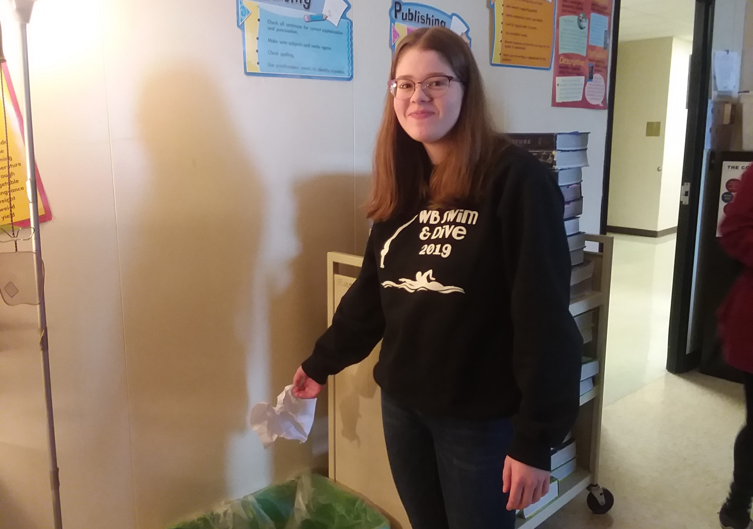 DeLain said that recycling bins are found everywhere throughout the West Bend High Schools, from the cafeteria to the classrooms. In the cafeteria, there are special garbage cans created by SEED that have cutout tops, designed specifically for glass bottles and aluminum cans.