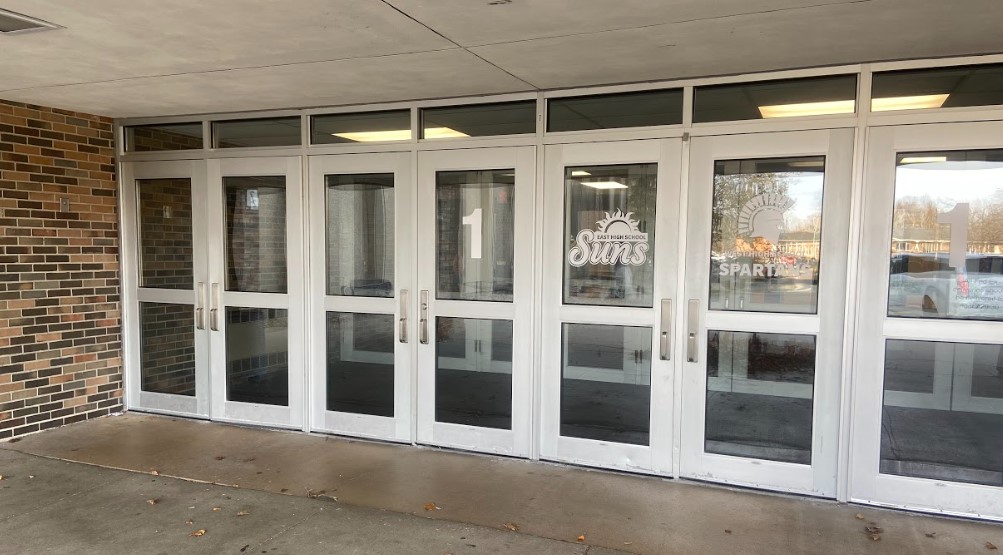 (Top image: The West Bend West High School main entrance. Photo taken today by Dakota Gunnare, Current Staff.)