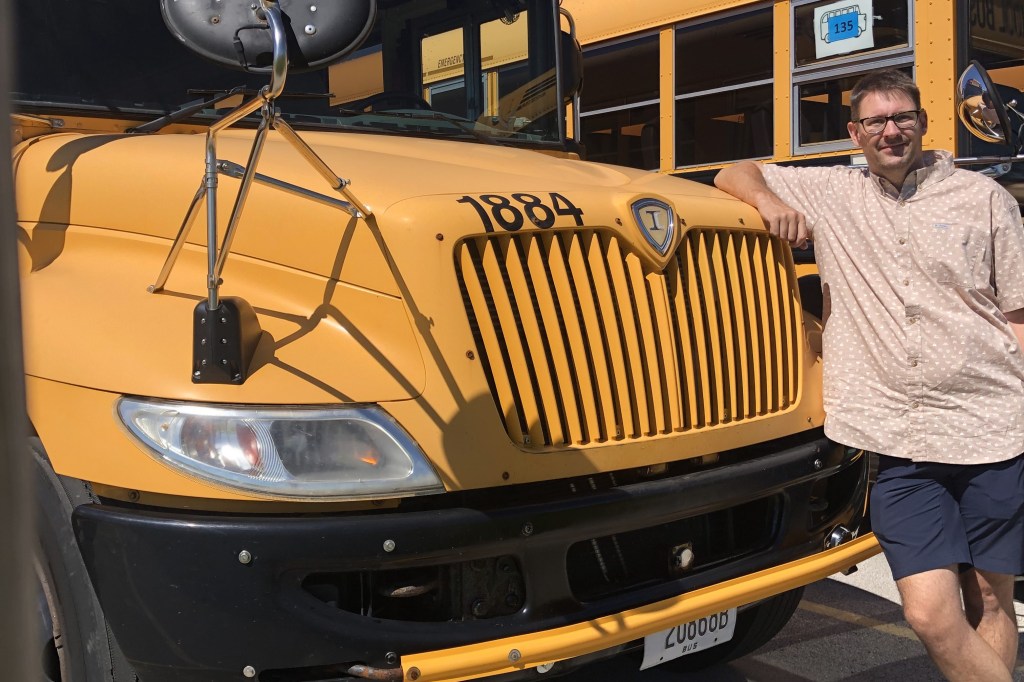 (Top image: Michael Bentdahl poses Sept. 1 at the Go Riteway terminal in Germantown, right after he passed his bus driving test. Photo courtesy of Bentdahl.)