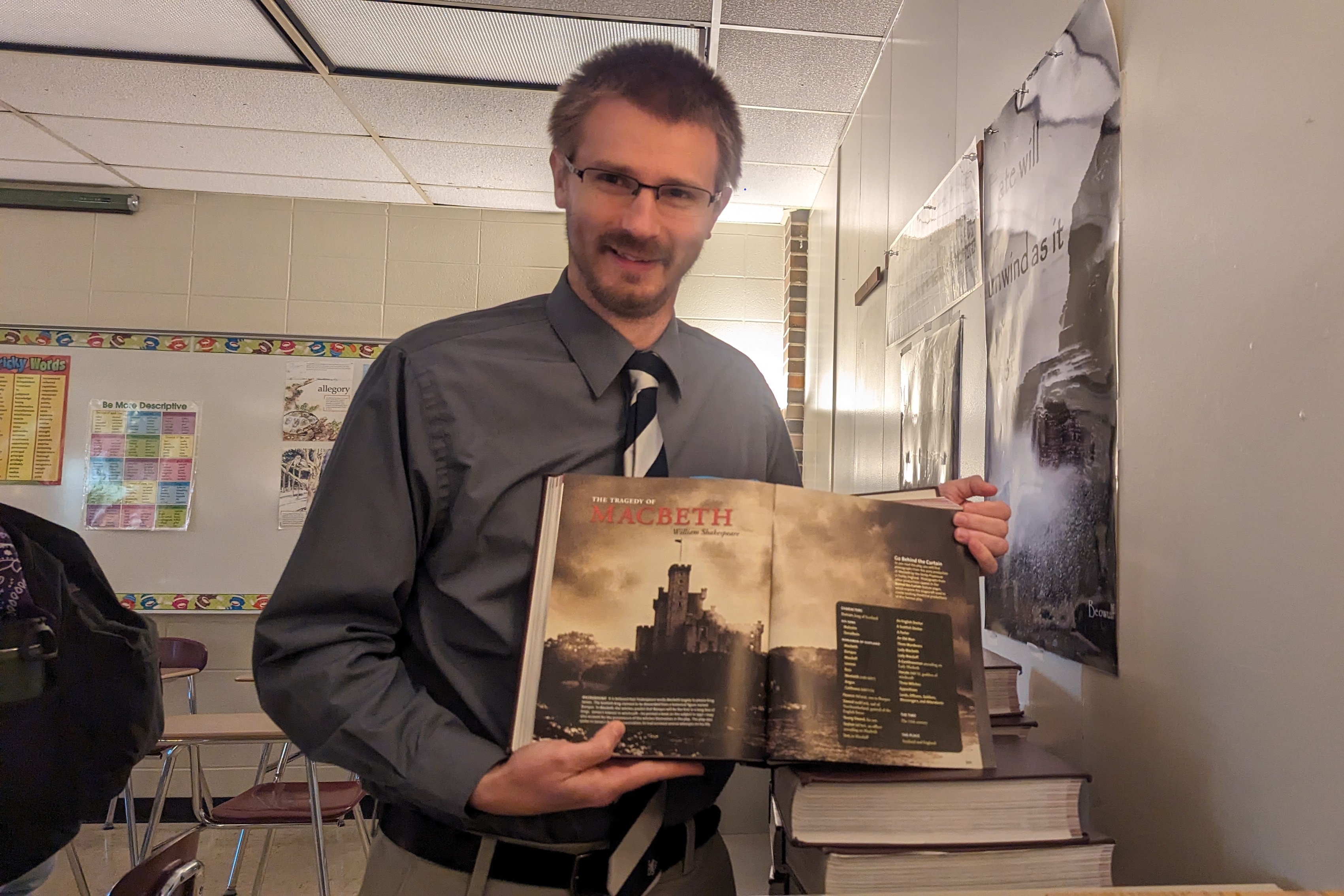 (Top image: Brett Hartman poses Thursday with a textbook copy of ‘Macbeth.’ Photo by Mia Herdeman, Current Staff.)