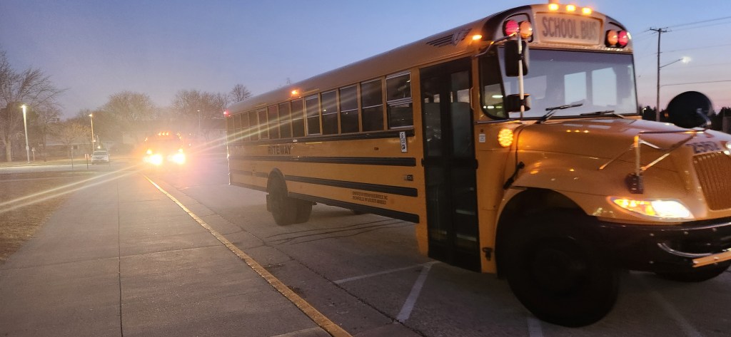 (Top image: In this photo taken from inside a parked bus, law enforcement, students and staff gather at the scene in the aftermath of a serious fight on the West Bend East High School campus. Photo taken Friday by Keaton Beltmann, Current Staff.)